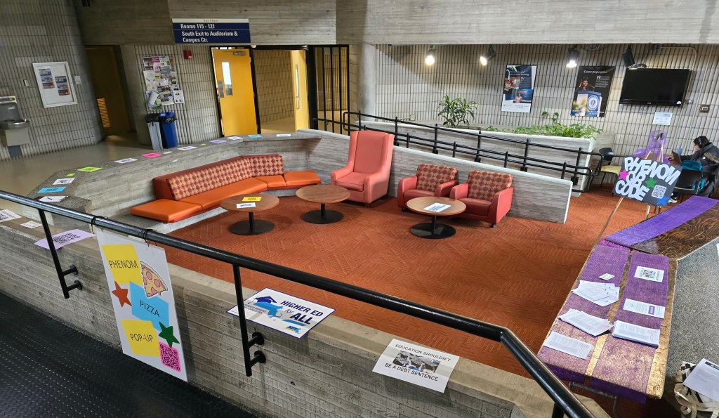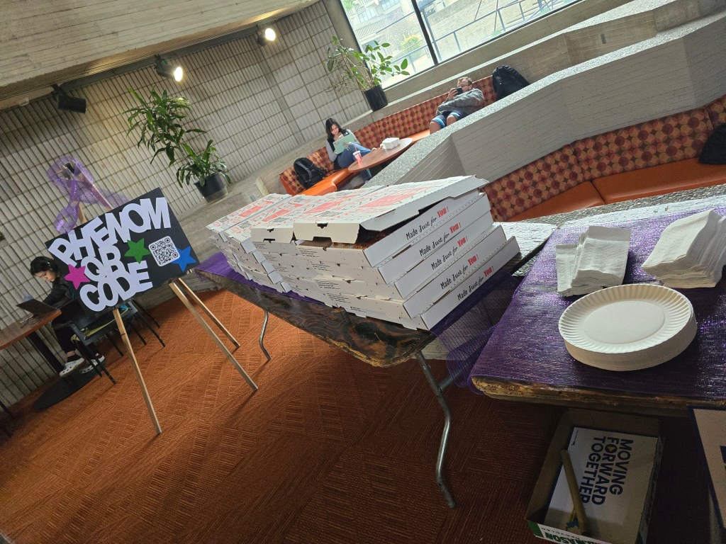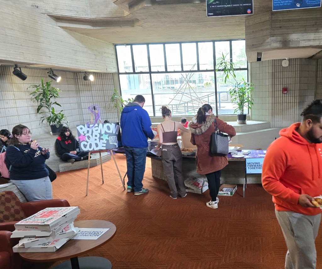 PHENOM’s Pizza Pop-up was today – and it was extremely successful at spreading the word about a chapter here at UMASSD. Students, about 120 of them in total, had to scan a QR code to get to PHENOM’s webpage, with optional sign up sheets for those wanting to get more involved or who were interested in future internships and fellowships (we got about 15 names, that is pretty good) in order to get slices of pizza. Then our student fellow, Todd Deslauriers, and I had quick informative convos about PHENOM’s goals and the budget hearing happening today at the State House, etc. We gave out every single slice in about 20 minutes during the change of classes in LARTS – here are the photos of my set-up before we got bombarded (at one point we had a line):